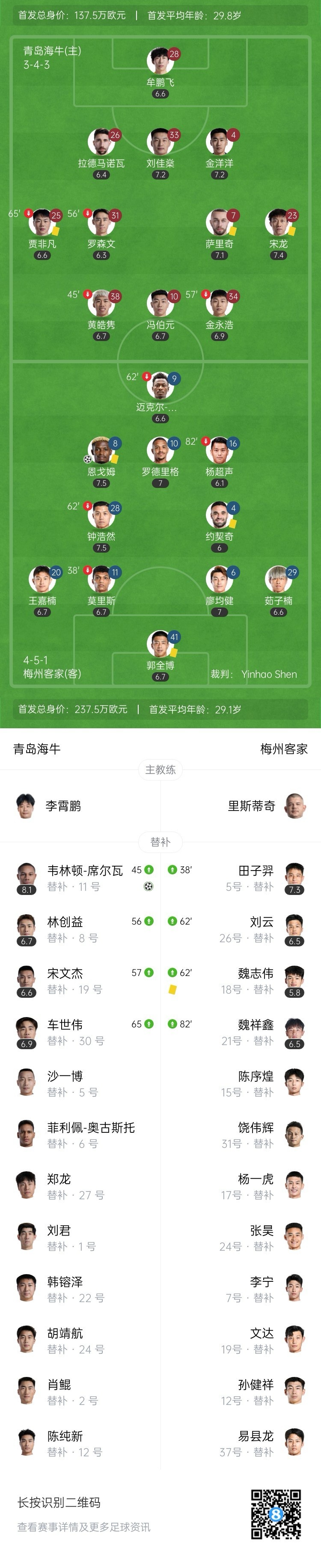全場比賽結(jié)束,青島海牛1-1戰(zhàn)平梅州客家。